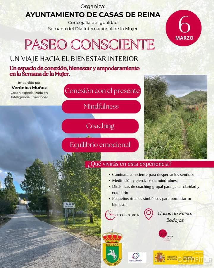 El Ayuntamiento de Casas de Reina, a través de la concejalía de Igualdad, ha programado para el próximo 6 de marzo una propuesta centrada en el autocuidado y la conexión personal: “Paseo Consciente. Un viaje hacia el bienestar interior”, una experiencia diseñada para vivir la naturaleza de otra manera, con calma, atención plena y dinámicas de crecimiento personal.