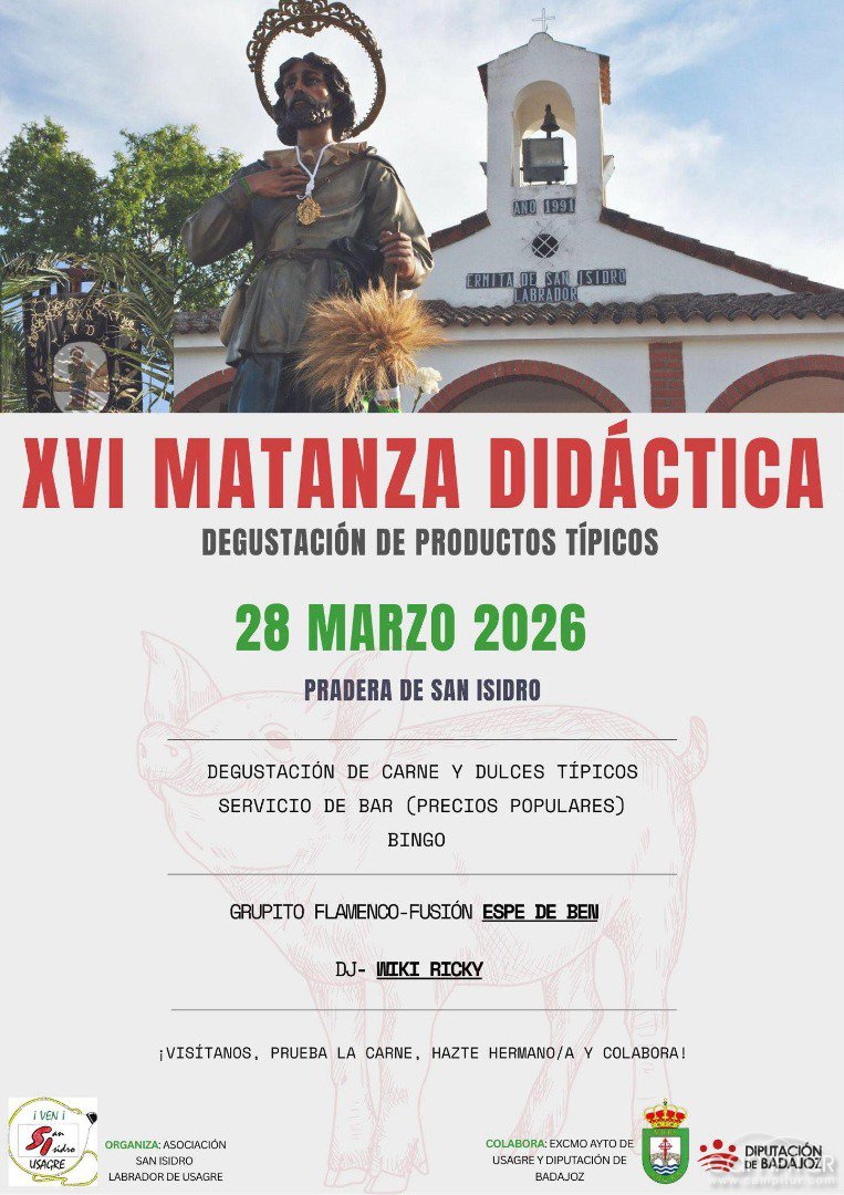 La localidad de Usagre volverá a rendir homenaje a sus tradiciones con la celebración de la XVI Matanza Didáctica, una cita ya consolidada en el calendario festivo del municipio que tendrá lugar el sábado 28 de marzo de 2026 en la Pradera de San Isidro. La jornada está planteada como un encuentro de convivencia en torno a la cultura popular y la gastronomía de la comarca, con actividades para públicos de todas las edades.